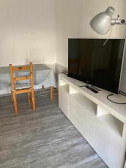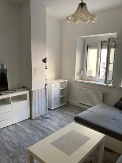 Das Wohnzimmer ist neu renoviert und eingerichtet mit einem Sofa (auch zum Schlafen geeignet), Tisch, Schreibtisch, Kommoden, TV-Gerät und genügend Ablagemöglichkeiten.
