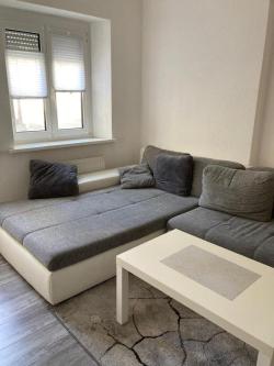 Das Wohnzimmer ist neu renoviert und eingerichtet mit einem Sofa (auch zum Schlafen geeignet), Tisch, Schreibtisch, Kommoden, TV-Gerät und genügend Ablagemöglichkeiten.