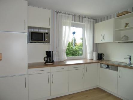 Die große Wohnküche ist mit einer Essecke (Eckbank, Stühle und Esstisch) eingerichtet. Die Küche ist komplett mit Geschirr, Besteck usw. ausgestattet.